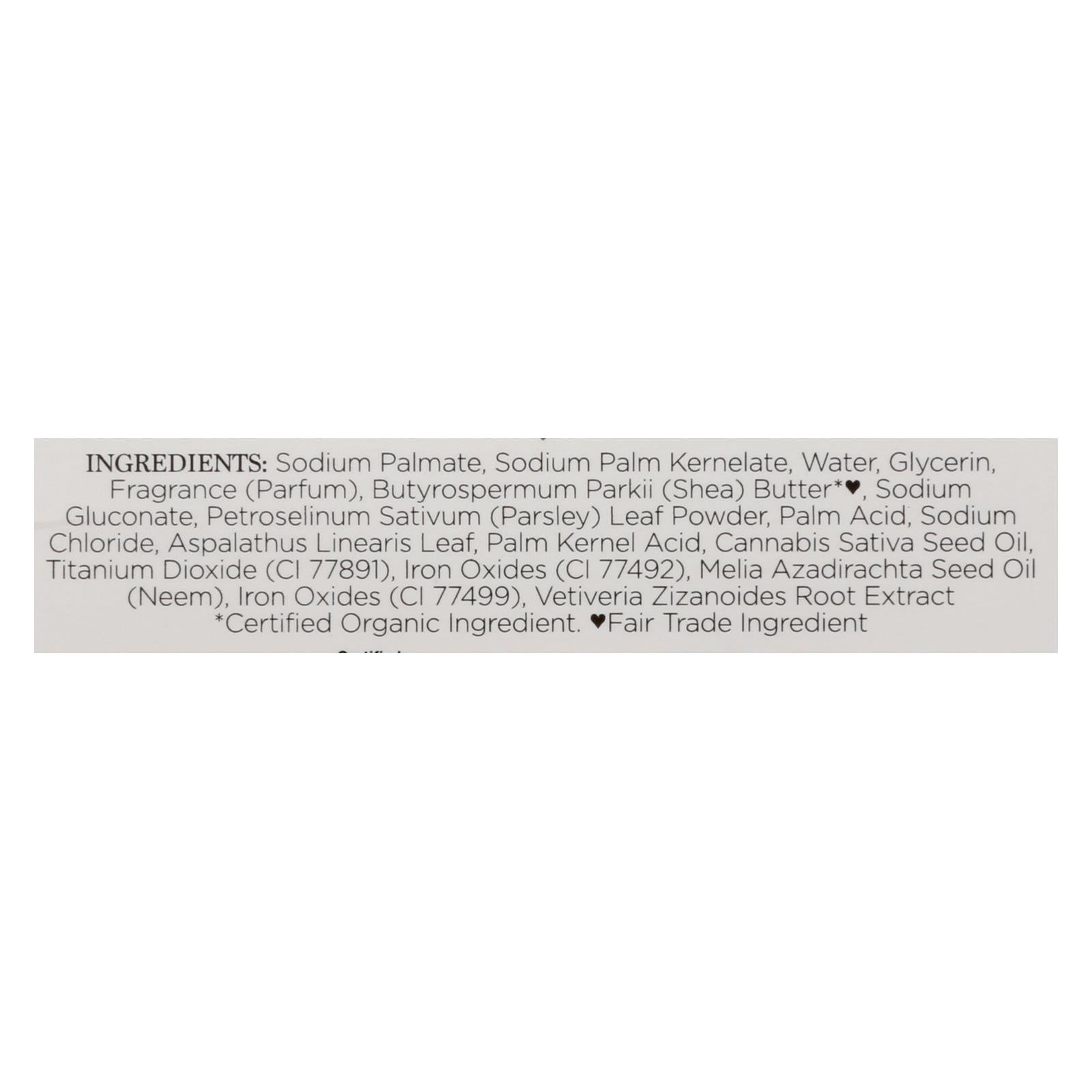 ingredients : sodium palmate;sodium palm kernelate;water;glycerin;fragrance;parfum;butyrospermum parkii;shea;butter*•;sodium gluconate;petroselinum sativum;parsley;leaf powder;palm acid;sodium chloride;aspalathus linearis leaf;palm kernel acid;cannabis sativa seed oil;titanium dioxide;ci 77891;iron oxides;ci 77492;melia azadirachta seed oil;neem;ci 77499;vetiveria zizanoides root extract