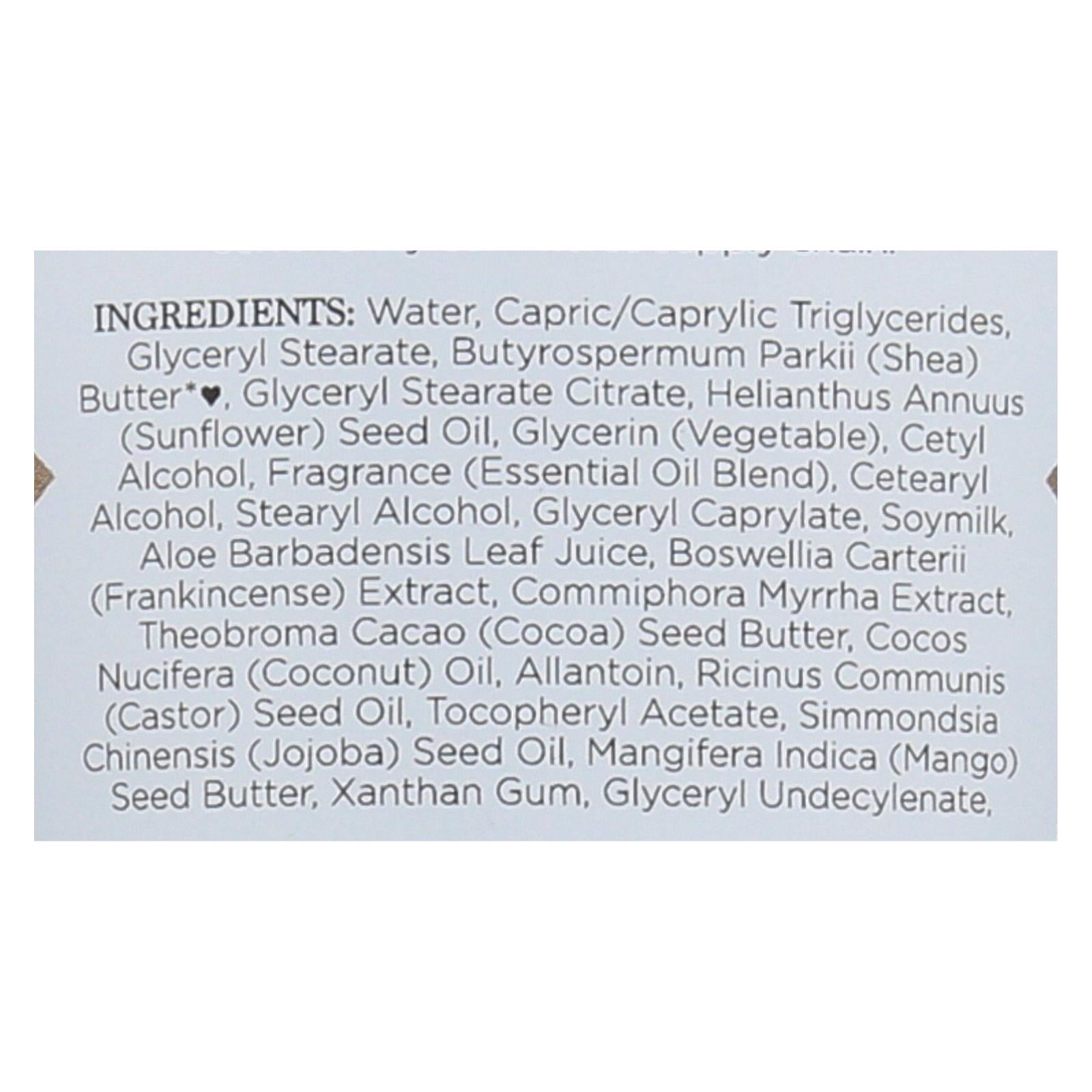ingredients : water;capric/caprylic triglycerides;glyceryl stearate;butyrospermum parkii;shea;butter*♥;glyceryl stearate citrate;helianthus annuus;sunflower;seed oil;glycerin;vegetable;cetyl alcohol;fragrance;essential oil blend;cetearyl alcohol;stearyl alcohol;glyceryl caprylate;soymilk;aloe barbadensis leaf juice;boswellia carterii;frankincense;extract;commiphora myrrha extract;theobroma cacao;cocoa;seed butter;cocos nucifera;coconut;oil;allantoin;ricinus communis;castor;tocopheryl acetate;simmondsia chinen