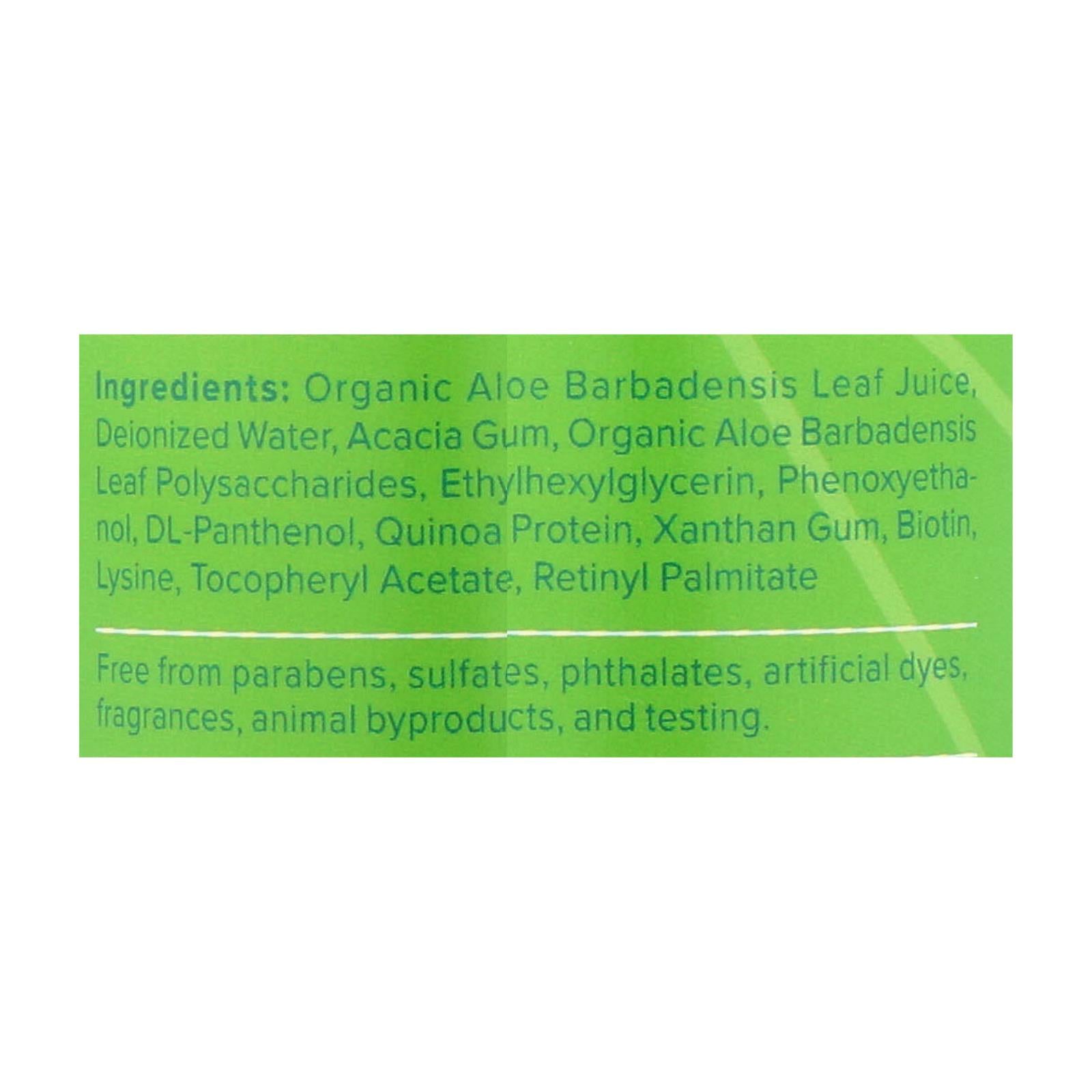 ingredients : organic aloe barbadensis leaf juice;reverse osmosis water;pvp;acacia gum;organic aloe barbadensis leaf polysaccharide;ethylhexylglycerin;phenoxyethanol;dl-panthenol;quinoa protein;xanthan gum;biotin;lysine;tocopheryl acetate;retinyl palmitate