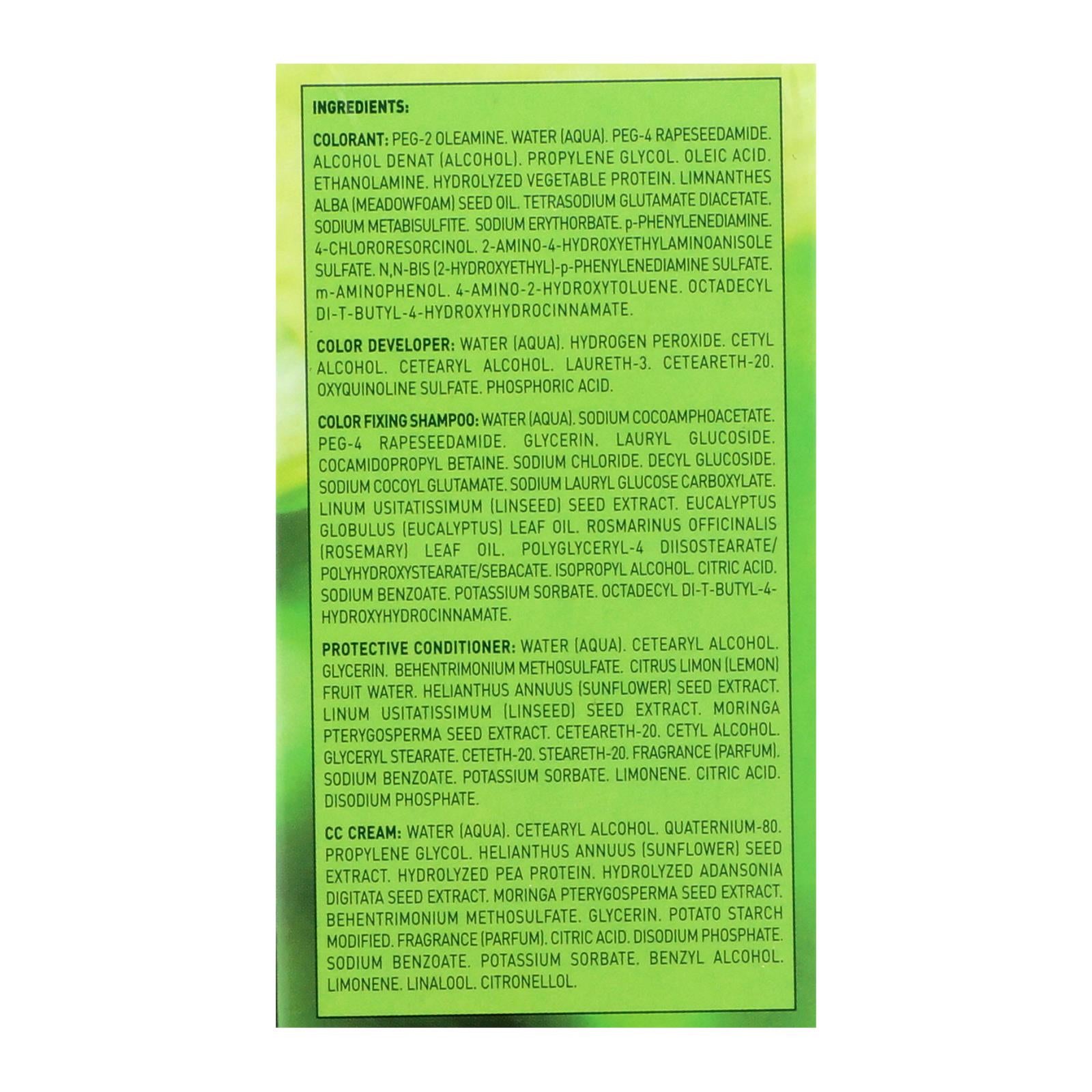 ingredients : cc cream: water;aqua;cetearyl alcohol;quaternium-80;propylene glycol. Helianthus annuus;sunflower;seed extract. Hydrolyzed pea protein. Hydrolyzed adansonia digitata seed extract. Moringa pterygosperma seed extract. Behentrimonium methosulfate. Glycerin. Potato starch modified. Fragrance;parfum;citric acid. Disodium phosphate. Sodium benzoate. Potassium sorbate. Benzyl alcohol. Limonene. Linalool. Citronellol;color developer: water;hydrogen peroxide. Cetyl alcohol. Cetearyl alcohol. Laureth-3. C