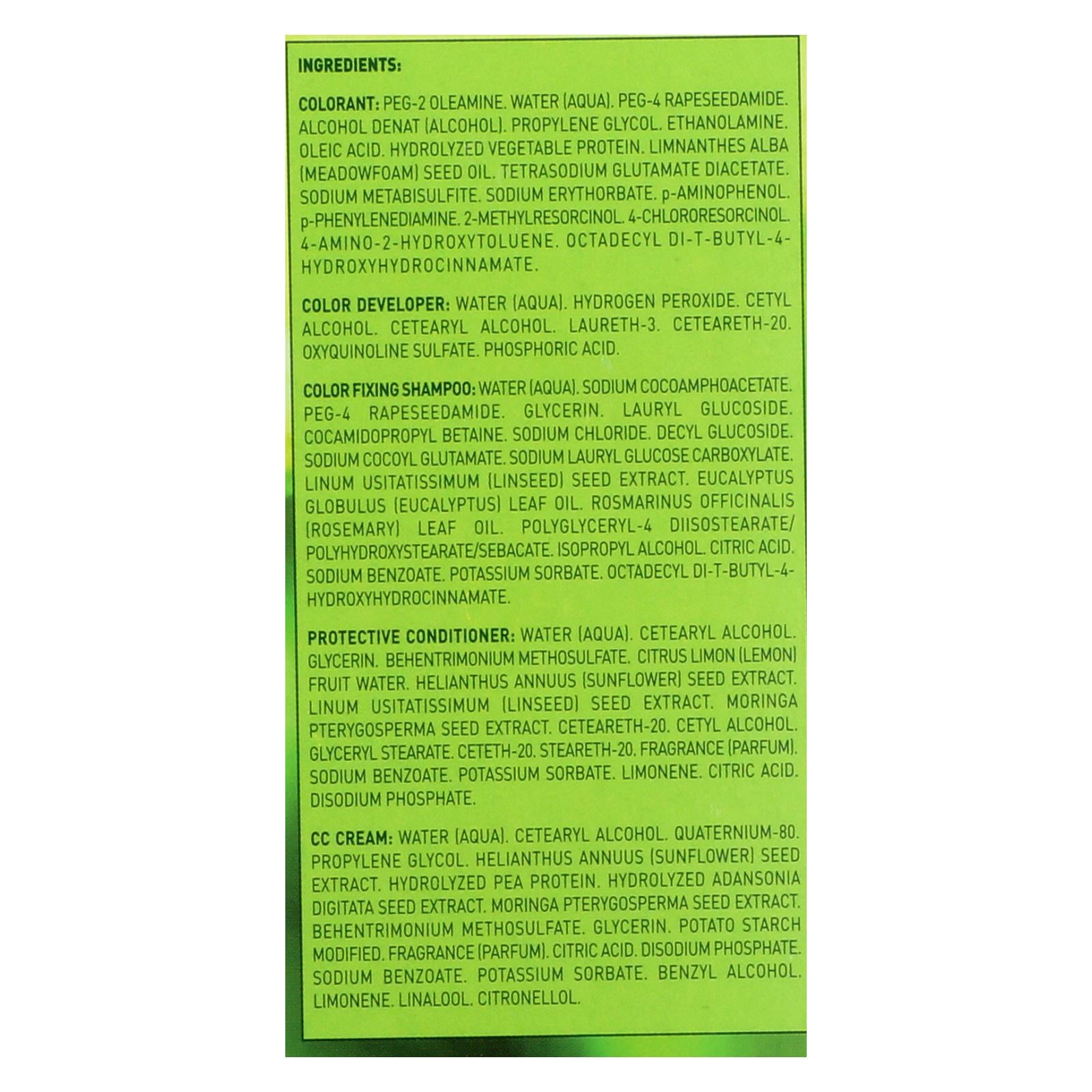 ingredients : cc cream: water;aqua;cetearyl alcohol;quaternium-80;propylene glycol. Helianthus annuus;sunflower;seed extract. Hydrolyzed pea protein. Hydrolyzed adansonia digitata seed extract. Moringa pterygosperma seed extract. Behentrimonium methosulfate. Glycerin. Potato starch modified. Fragrance;parfum;citric acid. Disodium phosphate. Sodium benzoate. Potassium sorbate. Benzyl alcohol. Limonene. Linalool. Citronellol;color developer: water;hydrogen peroxide. Cetyl alcohol. Cetearyl alcohol. Laureth-3. C