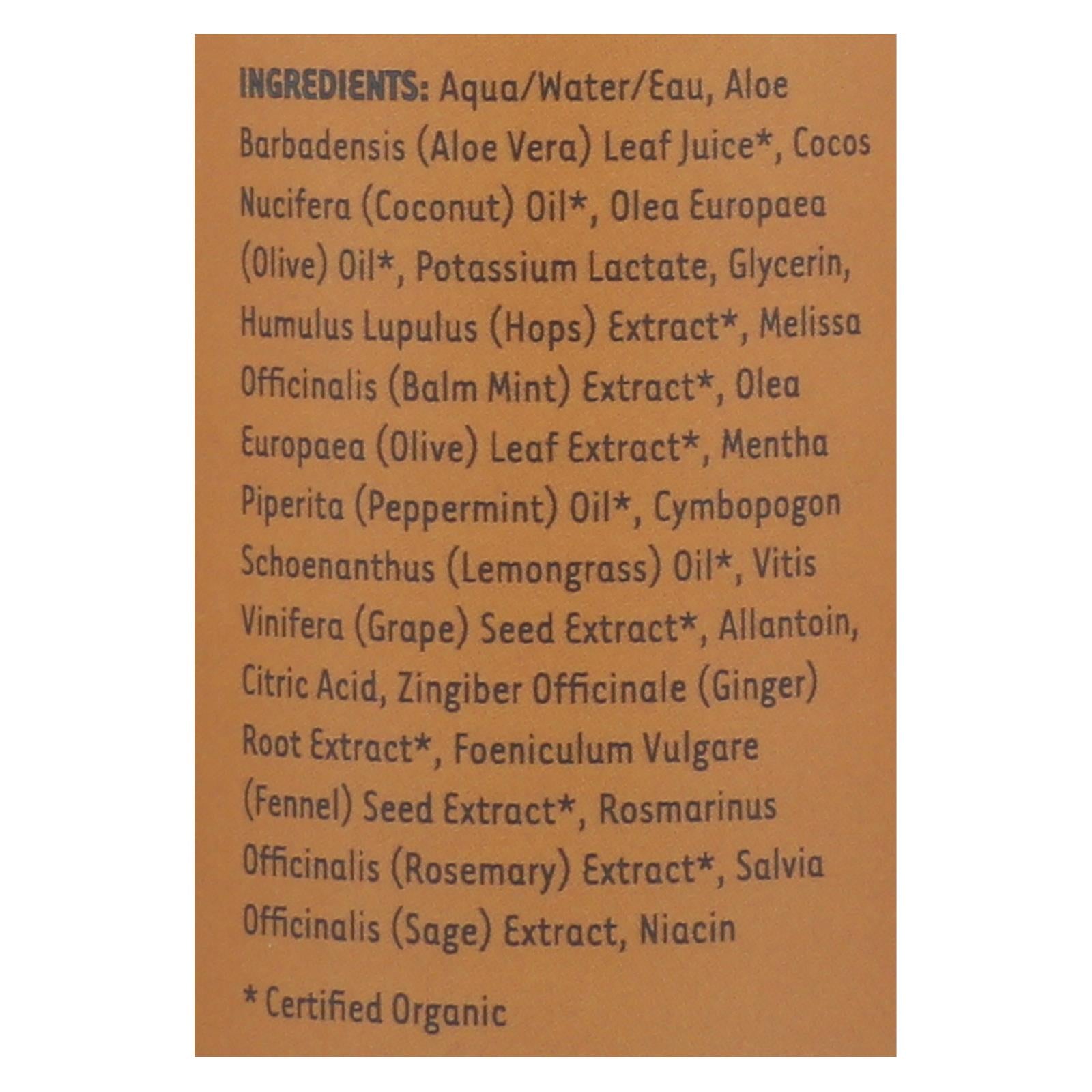 ingredients : aqua/water/eau;aloe barbadensis;aloe vera;leaf juice;cocos nucifera;coconut;oil;olea europaea;olive;potassium lactate;glycerin;humulus lupulus;hops;extract;melissa officinalis;balm mint;leaf extract;mentha piperita;peppermint;cymbopogon schoenanthus;lemongrass;vitis vinifera;grape;seed extract;allantoin;citric acid;zingiber officinale;ginger;root extract;foeniculum vulgare;fennel;rosmarinus officinalis;rosemary;salvia officinalis;sage;niacin