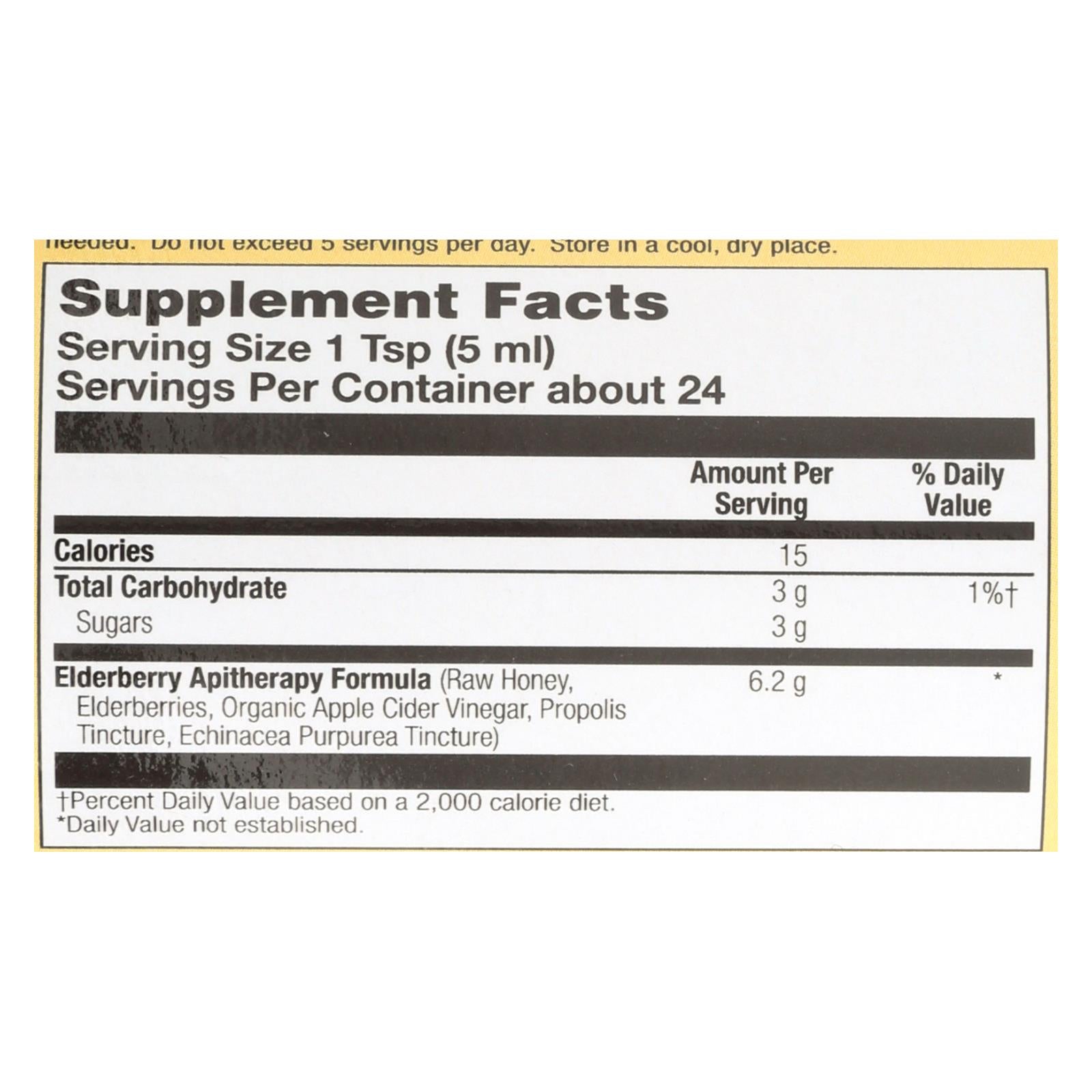 Honey gardens traditional immune formula elderberry syrup herbal supplement provides you with a custom blend of nutrients, including raw honey, apple cider vinegar and propolis. To use, take one tsp. Every two hours as needed. This bottle contains 4 fl. Oz. Of elderberry syrup herbal supplement with approximately 24 servings.