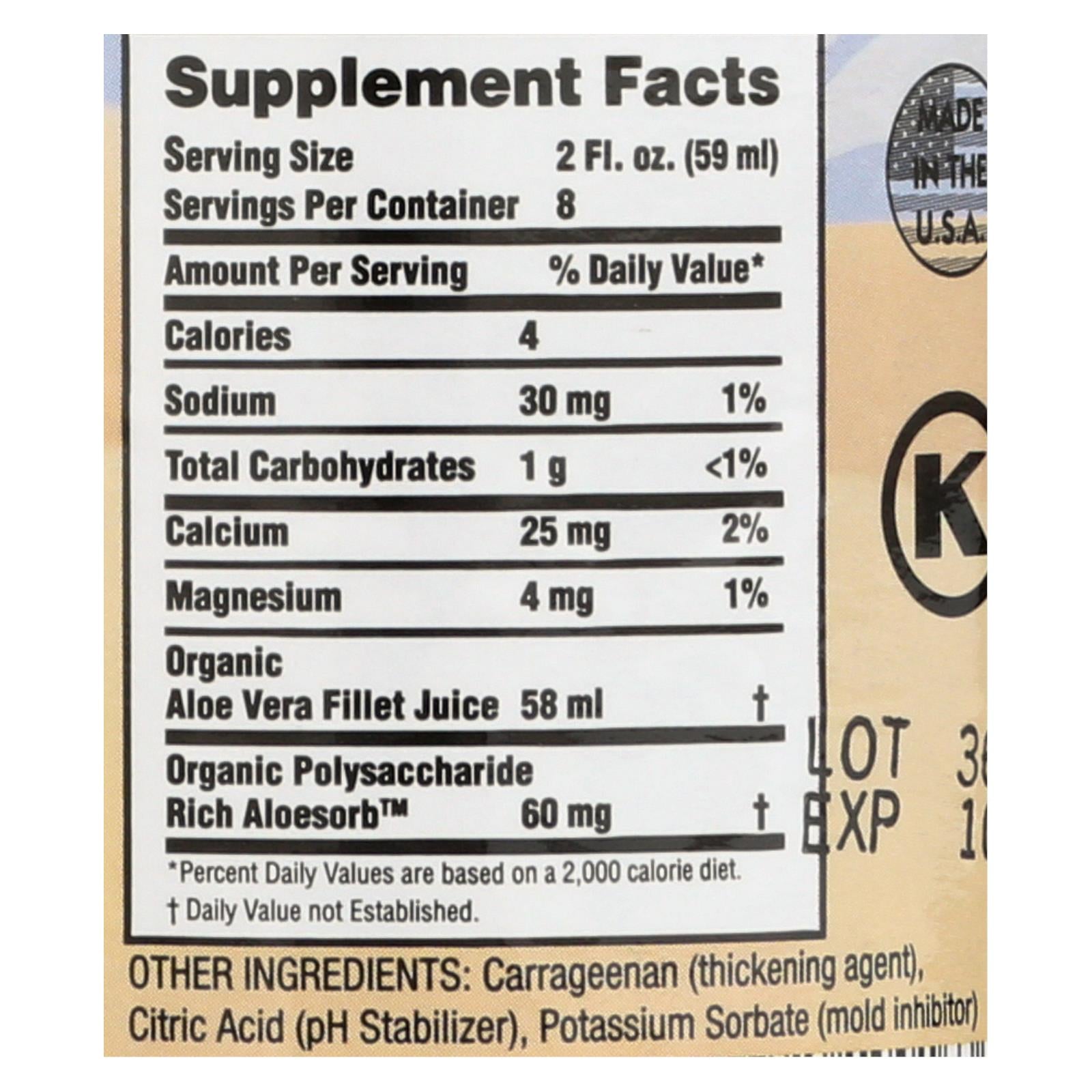 Lily of the desert aloe vera gel is a dietary supplement made with all organic ingredients including 99% aloe vera juice, carrageenan and citric acid, and is rich in antioxidants. One 16 oz. Bottle of aloe vera gel is kosher and contains 25 mg. Of calcium per serving to help support a healthy immune system and digestive regularity.