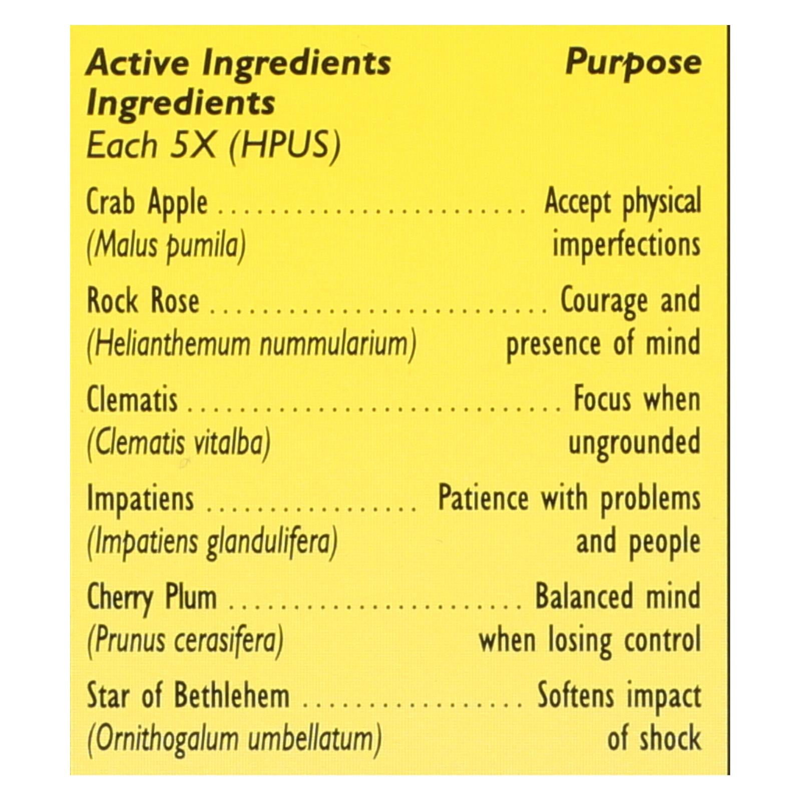 ingredients : active each 5x;hpus;crab apple;malus pumila;purpose accept physical imperfections each 5x;rock rose;helianthemum nummularium;purpose each 5x;courage and presence of mind each 5x;clematis;clematis vitalba;purpose focus when ungrounded each 5x;impatiens;impatiens glandulifera;purpose patience with problems and people each 5x;cherry plum;prunus cerasifera;purpose balanced mind when losing control each 5x;star of bethlehem;ornithogalum umbellatum;purpose softens impact of shock;inactive beesw