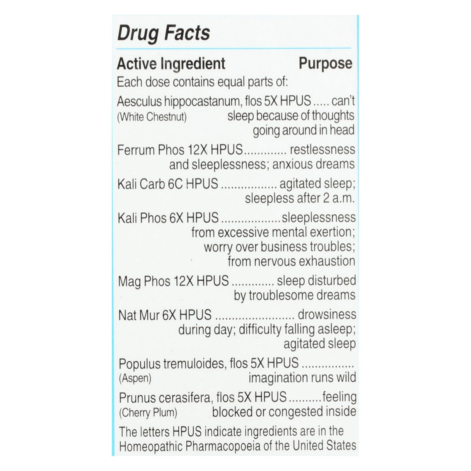 <tr><td>Natural flower essences and cell salts</td><td>Reduces anxiety and mental chatter for easier sleep</td></tr>