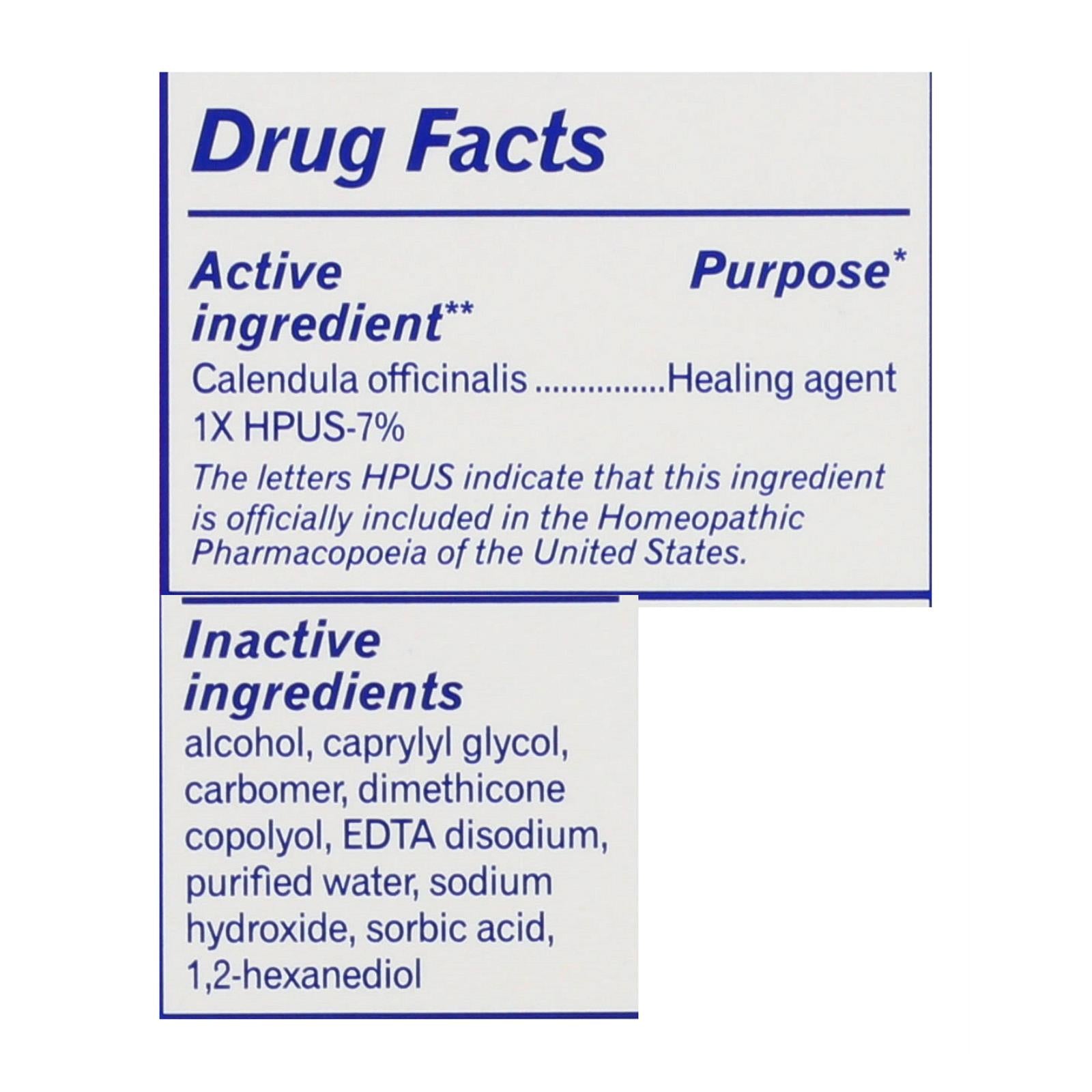 ingredients : active ingredient** calendula officinalis 1x hpus-7% purpose* healing agent inactive alcohol;caprylyl glycol;carbomer;dimethicone copolyol;edta disodium;purified water;sodium hydroxide;sorbic acid;1;2-hexanediol