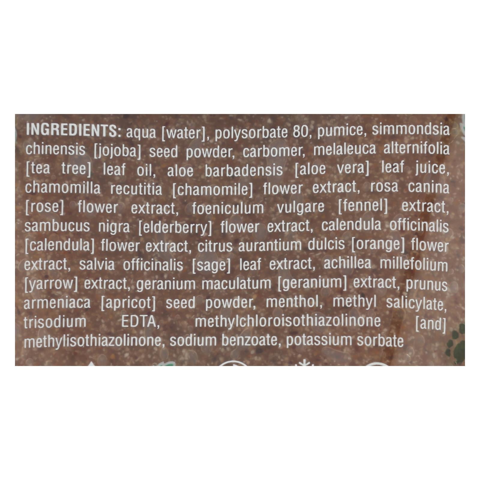 ingredients : aqua [water];polysorbate 80;pumice;simmondsia chinensis [jojoba] seed powder;carbomer;melaleuca alternifolia [tea tree] leaf oil;aloe barbadensis [aloe vera] leaf juice;chamomilla recutita [chamomile] flower extract;rosa canina [rose] flower extract;foeniculum vulgare [fennel] extract;sambucus nigra [elderberry] flower extract;calendula officinalis [calendula] flower extract;citrus aurantium dulcis [orange] flower extract;salvia officinalis [sage] leaf extract;achillea millefolium [yarrow] extra