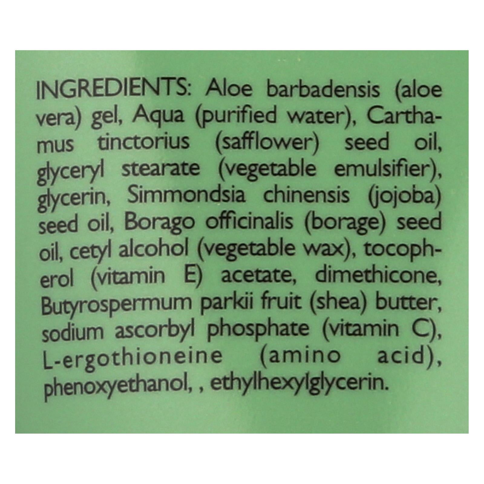 ingredients : aloe barbadensis;aloe vera;gel;aqua;purified water;carthamus tinctorius;safflower;seed oil;glyceryl stearate;vegetable emulsifier;glycerin;simmondsia chinensis;jojoba;borago officinalis;borage;cetyl alcohol;vegetable wax;tocopherol;vitamin e;acetate;dimethicone;butyrospermum parkii fruit;shea;butter;sodium ascorbyl phosphate;vitamin c;l-ergothioneine;amino acid;phenoxyethanol;ethylhexylglycerin